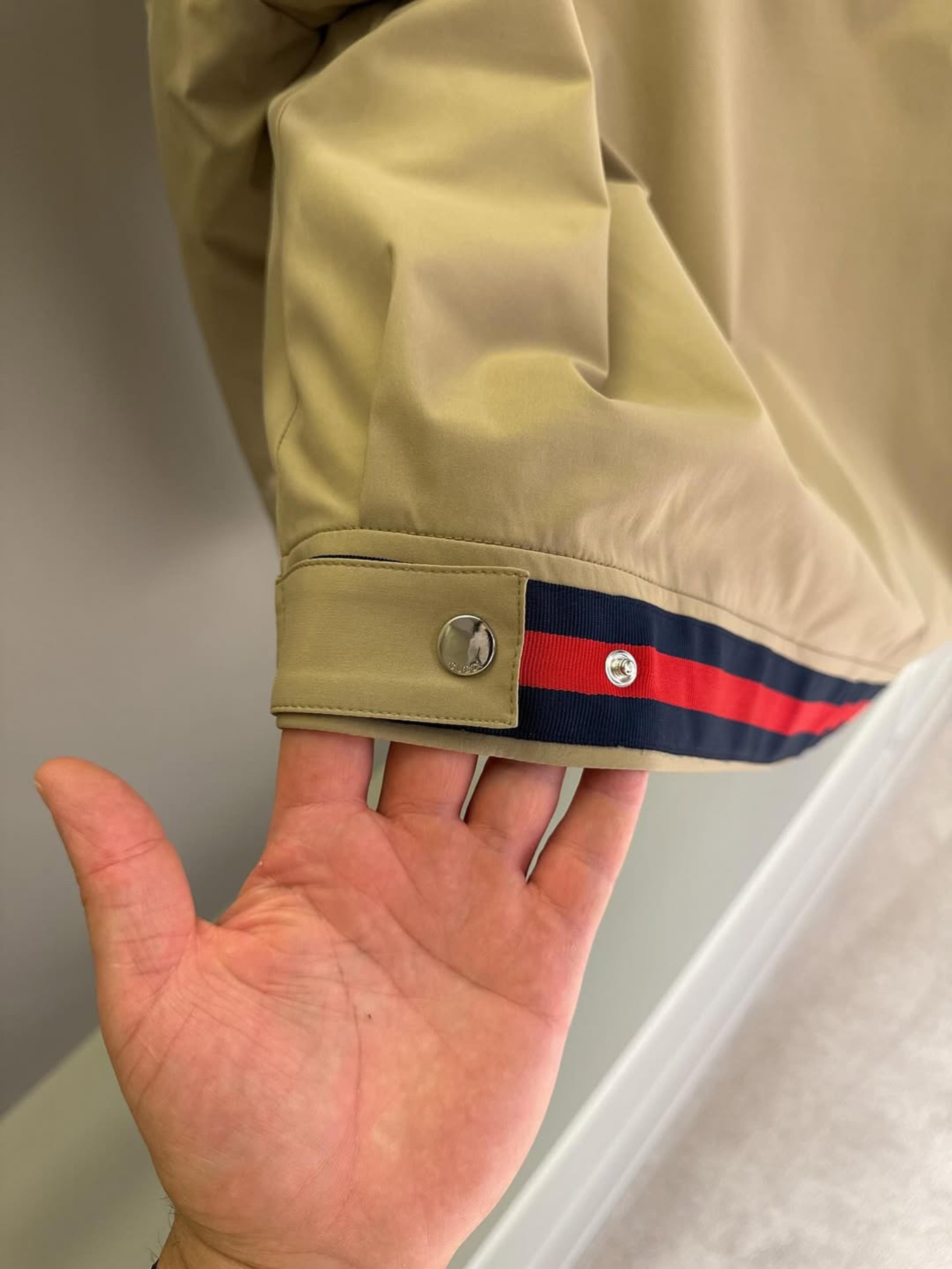 Gucci tasarımı olan bu bej ceket, modern ve şık çizgileriyle dikkat çeker. Düz formdaki dış yüzeyi, markanın ikonik GG monogram desenli iç astarıyla zenginleştirilmiştir. Ön kısmında yer alan ince nakış logo detayı, ürüne zarif bir dokunuş katmaktadır. Arka kısmındaki kırmızı-lacivert şerit detay ve manşetlerdeki metal düğmeler, markanın klasik imzasını yansıtır. Hafif yapısı ve kaliteli işçiliği sayesinde hem günlük kombinlerde hem de şık görünümlerde rahatlıkla tercih edilebilecek zamansız bir parçadır.